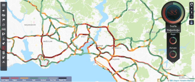 İstanbul Büyükşehir Belediyesi Trafik Yoğunluğu Haritası verilerine göre saat 18.30 itibariyle yoğunluk yüzde 85’e ulaştı.