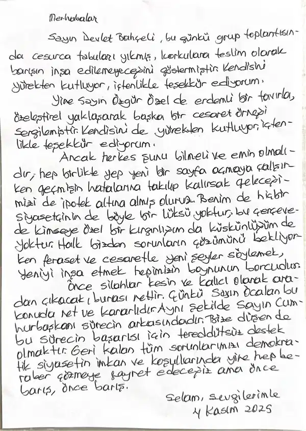 “Sayın Devlet Bahçeli, bugünkü grup toplantısında cesurca tabuları yıkmış, korkulara teslim olarak barışın inşa edilemeyeceğini göstermiştir. Kendisini yürekten kutluyor, içtenlikle teşekkür ediyorum. Yine Sayın Özgür Özel de erdemli bir tavırla, özeleştirel yaklaşarak başka bir cesaret örneği sergilemiştir. Kendisini de yürekten kutluyor, içtenlikle teşekkür ediyorum.”